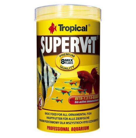 SUPERVIT är ett högkvalitativt, komplett, innehållsrikt flingfoder avsett för daglig utfodring av all akvariefisk. Det är sammansatt av åtta olika sorters näringsriktiga flingor, som skiljer sig i dess innehåll med tanke på de olika näringsbehov som fiskar uppfödda tillsammans med andra arter har. Fodret innehåller en naturlig immunstimulator BETA-1,3/1,6-GLUCAN och stabiliserad vitamin C, som effektivt höjer fiskens immunsystem och skyddar mot diverse infektioner. Cellulosa och chitin förbättrar matsmältning och förhindrar förstoppning, karotenoider förstärker färger och lecithin ökar vitaliteten och hjälper till att stimulera uppfödningen.